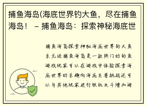 捕鱼海岛(海底世界钓大鱼,尽在捕鱼海岛! - 捕鱼海岛:探索神秘海底世界,钓大鱼乐无边)